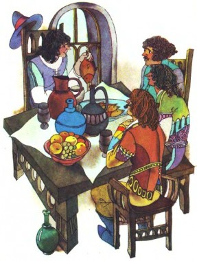 Принесла наймичка Гаспарові тарілку, і сів він до столу. Аж тут поставили перед паном величезний таріль із смаженою рибою.
